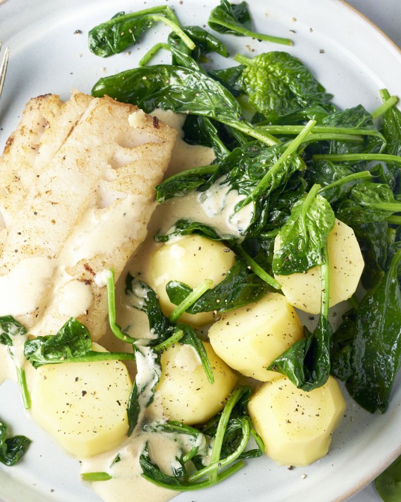 Kabeljauwrug met Spinazie, garnaaltjes en puree